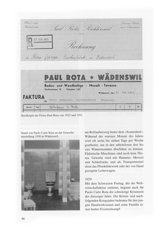 Der nun mit der Gersauerin Ida Küttel verheiratete Plattenleger Paul Rota, so die Berufsbezeichnung, gründet in Richterswil eine eigene Firma und empfiehlt sich im Briefkopf für Terrazzo-Böden und Schüttsteine. 1930 verlegt er den Sitz nach Wädenswil. Bewohnt wird das Haus Gerbestrasse 10; Werkstatt und Magazin – erreichbar unter Telefon 552 – befinden sich am Reblaubenweg hinter dem «Sonnenhof». Während der warmen Monate des Jahres wird oft sechs bis sieben Tage pro Woche gearbeitet, um in den arbeitslosen drei bis vier Wintermonaten überleben zu können. Elektrische Maschinen sind noch kein Thema. Gewerkt wird mit Hammer, Meissel und Schleifstein, und als Transportmittel dient das Pferdefuhrwerk oder der von Hand gezogene Leiterwagen.