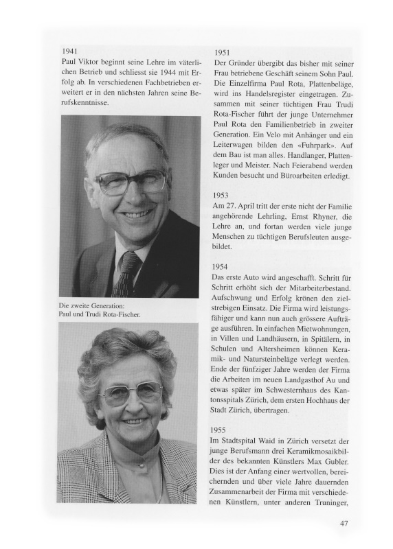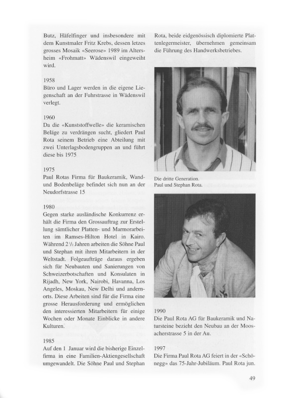 Auf den 1. Januar wird die bisherige Einzelfirma in eine Familien-Aktiengesellschaft umgewandelt. Die Söhne Paul und Stephan Rota, beide eidgenössisch diplomierte Plattenlegermeister, übernehmen gemeinsam die Führung des Handwerksbetriebes.