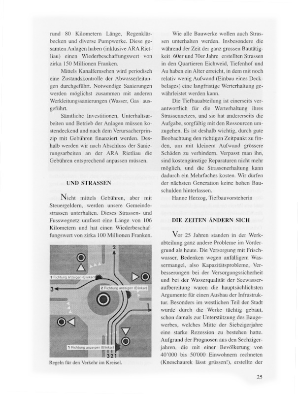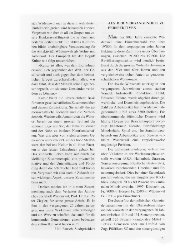 Danken möchte ich in diesem Zusammenhang auch dem Verfasser des Jahrbuches der Stadt Wädenswil, Prof. Dr. h.c. Peter Ziegler, für seine grosse Arbeit. Es ist ihm in den vergangenen 25 Jahren gelungen, uns unser Wädenswil näherzubringen und ein Werk zu schaffen, das auch für die kommenden Generationen einen bedeutenden kulturellen Wert haben wird.