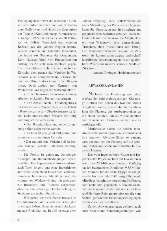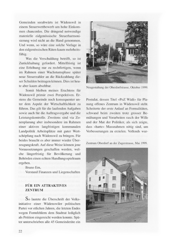 Das Planungs- und Baugesetz des Kantons Zürich (PBG) verpflichtet die Gemeinden, kommunale Richtpläne festzulegen, untergeordnet zum kantonalen und regionalen Richtplan. Der letzte Richtplan in Wädenswil stammt aus dem Jahr 1982. Seit Ende letzten Jahres arbeiten wir an den Festlegungen für etwa die nächsten 15 Jahre. Sehr aufschlussreich und von bedeutendem Stellenwert sind dabei die Ergebnisse der Tagung «Konsumkonzept Zimmerberg» vom April 1999, an der sich etwa 50 Vertreter von Politik, Wirtschaft und weitem Kreisen aus der ganzen Region überraschend deutlich zur Urbanität bekannten, das heisst zur Stärkung der Ortszentren.