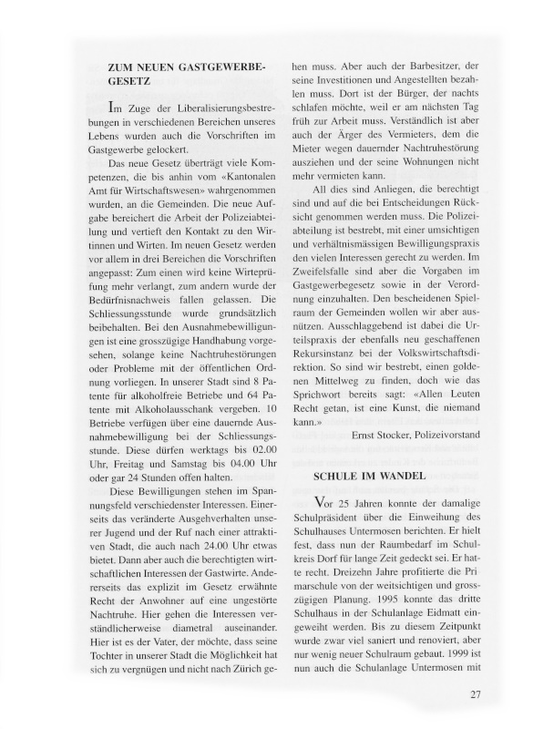 Das neue Gesetz überträgt viele Kompetenzen, die bis anhin vom «Kantonalen Amt für Wirtschaftswesen wahrgenommen wurden, an die Gemeinden. Die neue Aufgabe bereichert die Arbeit der Polizeiabteilung und vertieft den Kontakt zu den Wirtinnen und Wirten. Im neuen Gesetz werden vor allem in drei Bereichen die Vorschriften angepasst: Zum einen wird keine Wirteprüfung mehr verlangt, zum andern wurde der Bedürfnisnachweis fallen gelassen. Die Schliessungsstunde wurde grundsätzlich beibehalten. Bei den Ausnahmebewilligungen ist eine grosszügige Handhabung vorgesehen, solange keine Nachtruhestörungen oder Probleme mit der öffentlichen Ordnung vorliegen. In unserer Stadt sind 8 Patente für alkoholfreie Betriebe und 64 Patente mit Alkoholausschank vergeben. 10 Betriebe verfügen über eine dauernde Ausnahmebewilligung bei der Schliessungsstunde. Diese dürfen werktags bis 02.00 Uhr, Freitag und Samstag bis 04.00 Uhr oder gar 24 Stunden offen halten.