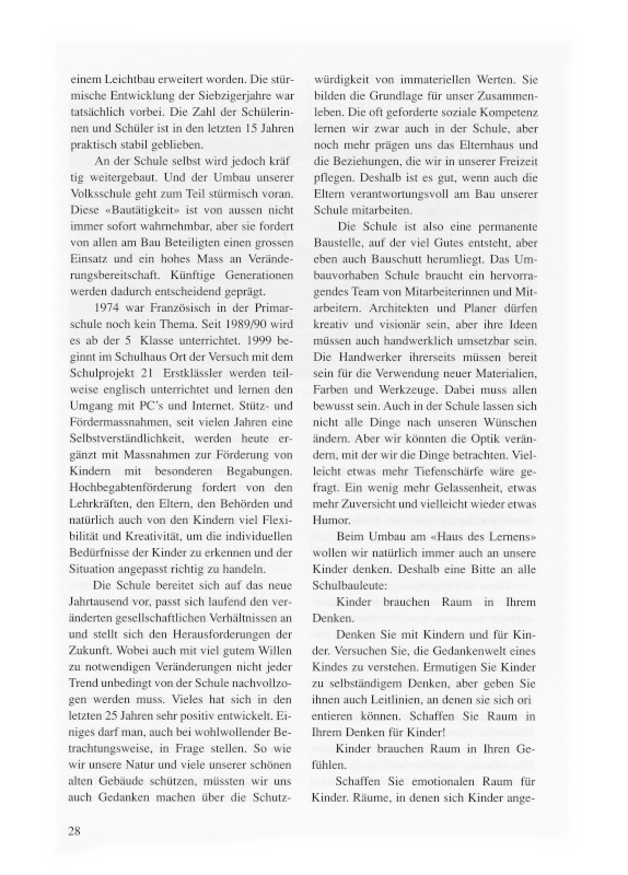 An der Schule selbst wird jedoch kräftig weitergebaut. Und der Umbau unserer Volksschule geht zum Teil stürmisch voran. Diese «Bautätigkeit» ist von aussen nicht immer sofort wahrnehmbar, aber sie fordert von allen am Bau Beteiligten einen grossen Einsatz und ein hohes Mass an Veränderungsbereitschaft. Künftige Generationen werden dadurch entscheidend geprägt.