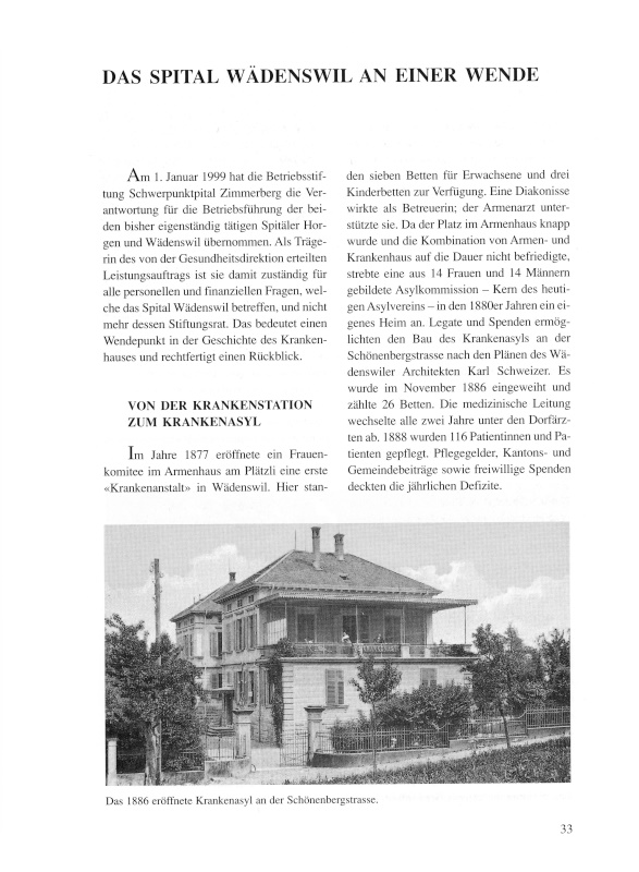 Unser Spital wird vom Zweckverband Spitalregion Linkes Zürichseeufer betrieben. Träger sind die Gemeinden Hirzel, Horgen, Hütten, Oberrieden. Richterswil, Schönenberg und Wädenswil. Seit dem 1. September 1999 gehört auch Thalwil zum Einzugsgebiet. Der Zweckverband sorgt im Rahmen des kantonalen Leistungsauftrags für den Betrieb der Kernbereiche Innere Medizin (Wädenswil), Chirurgie und Frauenklinik (beide in Horgen), des regionalen Anästhesie- und Radiologie-Dienstes sowie für die Notfallversorgung (Rettungsdienst, Notfallstation, Akutpflege inklusive Intensivpflegestation). Das Spital Zimmerberg hat diese Aufgaben am 1. Januar 1999 von den Spitalstiftungen Horgen und Wädenswil übernommen. Nach der Betriebsfusion wird die örtliche Zusammenlegung der beiden Spitalbetriebe in Horgen vorbereitet. Voraussichtlich können die Bürgerinnen und Bürger im Dezember 2000 über die Baukredite abstimmen.