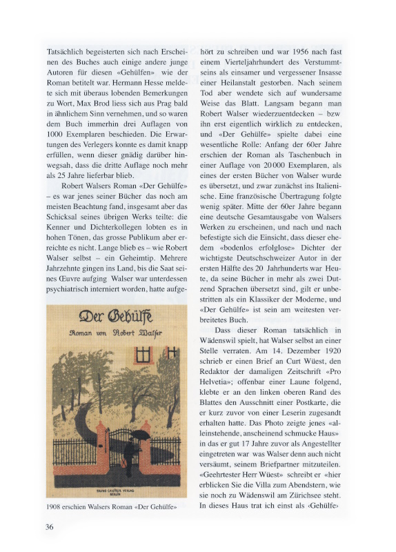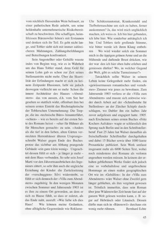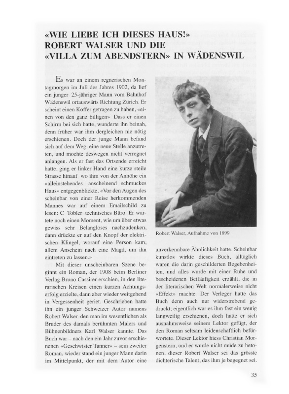 So bleibt ein drittes Mal von einem jungen Mann zu berichten, der − erneut einige Jahre später − nach Wädenswil aufbrach. Wiederum war es Sommer, wie es im Roman so wunderbar beschrieben ist. Blauer Himmel lag über dem See, in der Ferne sah man die Berge. All dies schien sich − man schrieb das Jahr 1979 − nicht verändert zu haben. Auch die Unkenntnis Walsers und seines Buches war in Wädenswil noch dieselbe geblieben. Auf der Strasse wusste niemand der Gefragten etwas von einem «Abendstern» oder gar einem Haus, in welchem der Dichter Robert Walser gelebt habe. Ansonsten war jedoch allenthalben zu beobachten, dass die Zeiten im Ort offenbar andere geworden waren. «Seine Gassen und Strassen gleichen Gartenwegen», hatte Robert Walser über sein «Bärenswil» noch geschrieben. Dies konnte man nun leider nicht mehr ohne weiteres behaupten. Dem Roman zufolge liessen sich die Bärenswiler «reizende, villenartige Gebäude aufrichten, deren unaufdringliche, aber graziöse Form der zufällige Beschauer noch heute bewundern und im Stillen beneiden» könne. Derartige schöne Villen riss man gerade verschiedentlich nieder, um an ihre Stelle moderne Banken- und Warenhausklötze zu setzen. Trotz allem aber konnte der Besucher, der aus Deutschland kam, Walsers Charakterisierung des Orts noch zustimmen: «Ja, Bärenswil ist ein hübsches und nachdenkliches Dorf.» Er bejaht diesen Satz heute umso mehr, als es ihn kurz darauf beruflich ins Robert Walser-Archiv verschlug, wo er unversehens zwanzig Jahre lang an der Entzifferung von Walsers Winzigschrift-Manuskripten hängen blieb, bis er schliesslich die Nachfolge des Dichters so weit trieb, dass er die vom Abbruch bedrohte «Villa zum Abendstern» erwarb, um sie zu erhalten und sie nach Möglichkeit wieder in ihren früheren Zustand zu versetzen.