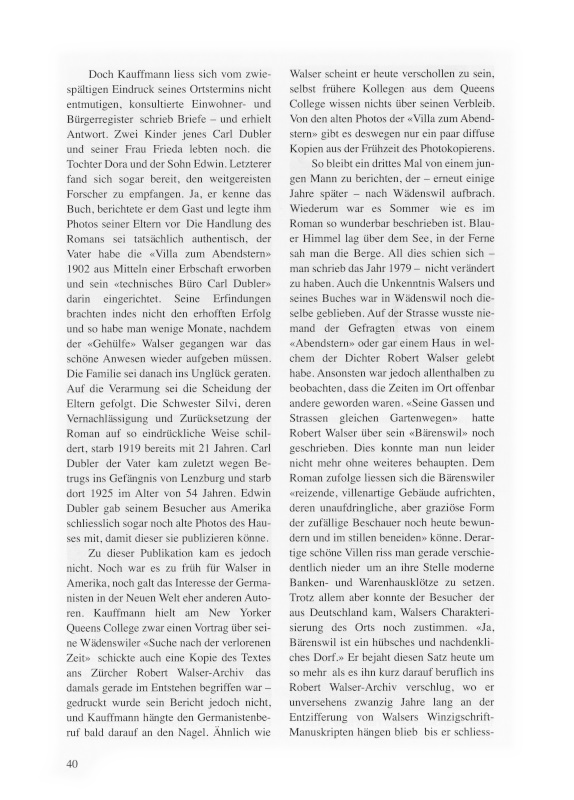 Zu dieser Publikation kam es jedoch nicht. Noch war es zu früh für Walser in Amerika, noch galt das Interesse der Germanisten in der Neuen Welt eher anderen Autoren. Kauffmann hielt am New Yorker Queens College zwar einen Vortrag über seine Wädenswiler «Suche nach der verlorenen Zeit», schickte auch eine Kopie des Textes ans Zürcher Robert Walser-Archiv, das damals gerade im Entstehen begriffen war, gedruckt wurde sein Bericht jedoch nicht, und Kauffmann hängte den Germanistenberuf bald darauf an den Nagel. Ähnlich wie Walser scheint er heute verschollen zu sein; selbst frühere Kollegen aus dem Queens College wissen nichts über seinen Verbleib. Von den alten Photos der «Villa zum Abendstern» gibt es deswegen nur ein paar diffuse Kopien aus der Frühzeit des Photokopierens.