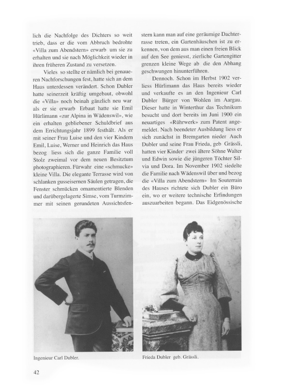 Doch Kauffmann liess sich vom zwiespältigen Eindruck seines Ortstermins nicht entmutigen, konsultierte Einwohner- und Bürgerregister, schrieb Briefe − und erhielt Antwort. Zwei Kinder jenes Carl Dubler und seiner Frau Frieda lebten noch: die Tochter Dora und der Sohn Edwin. Letzterer fand sich sogar bereit, den weitgereisten Forscher zu empfangen. Ja, er kenne das Buch, berichtete er dem Gast und legte ihm Photos seiner Eltern vor. Die Handlung des Romans sei tatsächlich authentisch; der Vater habe die «Villa zum Abendstern» 1902 aus Mitteln einer Erbschaft erworben und sein «technisches Büro Carl Dubler darin eingerichtet. Seine Erfindungen brachten indes nicht den erhofften Erfolg und so habe man wenige Monate, nachdem der «Gehülfe» Walser gegangen war, das schöne Anwesen wieder aufgeben müssen. Die Familie sei danach ins Unglück geraten: Auf die Verarmung sei die Scheidung der Eltern gefolgt. Die Schwester Silvi, deren Vernachlässigung und Zurücksetzung der Roman auf so eindrückliche Weise schildert, starb 1919 bereits mit 21 Jahren. Carl Dubler, der Vater, kam zuletzt wegen Betrugs ins Gefängnis von Lenzburg und starb dort 1925 im Alter von 54 Jahren. Edwin Dubler gab seinem Besucher aus Amerika schliesslich sogar noch alte Photos des Hauses mit, damit dieser sie publizieren könne.