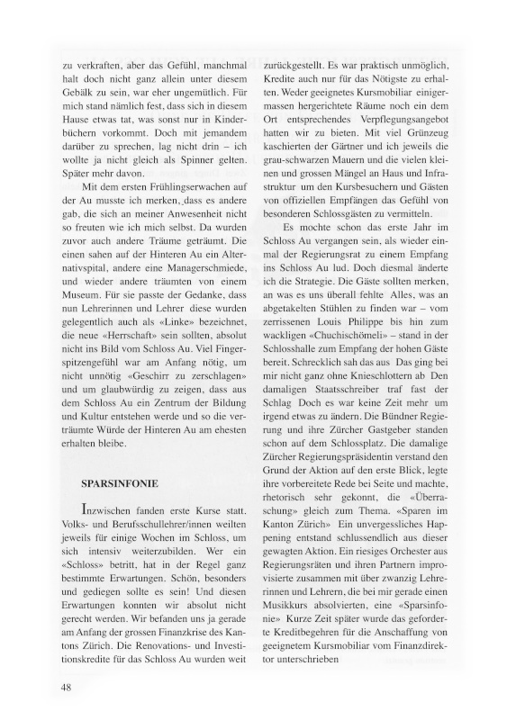 Mit dem ersten Frühlingserwachen auf der Au musste ich merken, dass es andere gab, die sich an meiner Anwesenheit nicht so freuten wie ich mich selbst. Da wurden zuvor auch andere Träume geträumt. Die einen sahen auf der Hinteren Au ein Alternativspital, andere eine Managerschmiede, und wieder andere träumten von einem Museum. Für sie passte der Gedanke, dass nun Lehrerinnen und Lehrer, diese wurden gelegentlich auch als «Linke» bezeichnet, die neue «Herrschaft» sein sollten, absolut nicht ins Bild vom Schloss Au. Viel Fingerspitzengefühl war am Anfang nötig, um nicht unnötig «Geschirr zu zerschlagen» und um glaubwürdig zu zeigen, dass aus dem Schloss Au ein Zentrum der Bildung und Kultur entstehen werde und so die verträumte Würde der Hinteren Au am ehesten erhalten bleibe.