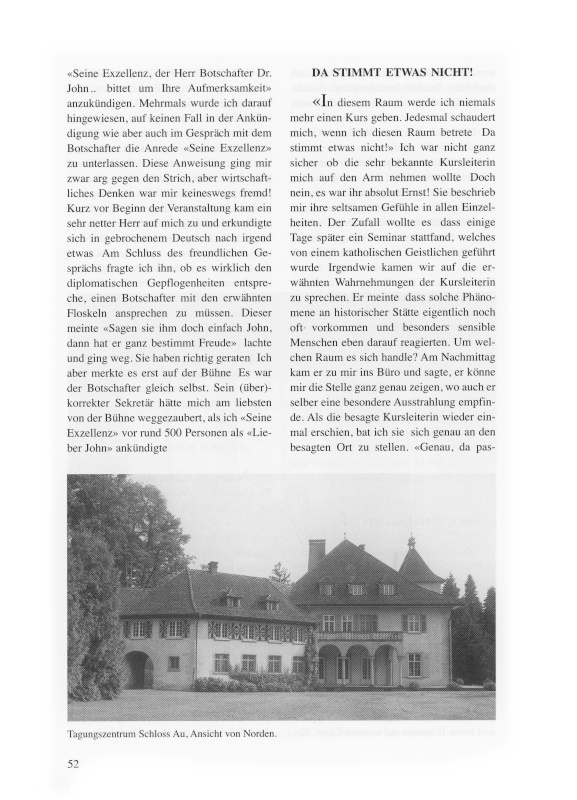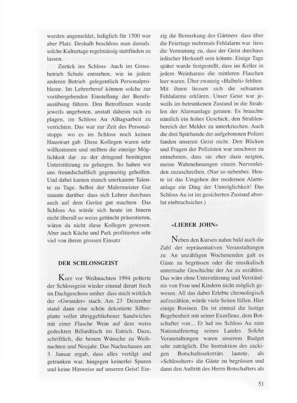 Es war schon ein besonderer Moment, als ich am 6. Januar 1992 mit meinem Büro in die ehemalige Wohnung des Gesindes über der Küche im Osttrakt des Schlosses einzog. Die Au war mir zwar schon recht vertraut; dem denkwürdigen Tag waren rum zwei Jahre intensiver Konzeptarbeit vorangegangen. Jetzt aber war ich im Besitze der Codewörter zur Entschärfung der damals komplett veralteten Sicherheitssysteme. Plötzlich so gewissermassen «Schlossherr» zu sein, war schon etwas Nichtalltägliches! Zwei Dinge gingen mir jeweils in jenen Wintermorgen auf dem neblig dunkeln Arbeitsweg zum Schloss durch den Kopf: Ob das Ganze wohl doch nur ein Traum und ob diese Abgeschiedenheit auf längere Zeit überhaupt erträglich sei. Und noch etwas: «Ist das komische Gefühl in der Magengegend beim Betreten des Schlosses doch so etwas wie Angst?» So ganz allein in einem so gewaltigen Haus zu arbeiten, war an sich zu verkraften, aber das Gefühl, manchmal halt doch nicht ganz allein unter diesem Gebälk zu sein, war eher ungemütlich. Für mich stand nämlich fest, dass sich in diesem Hause etwas tat, was sonst nur in Kinderbüchern vorkommt. Doch mit jemandem darüber zu sprechen, lag nicht drin − ich wollte ja nicht gleich als Spinner gelten. Später mehr davon.