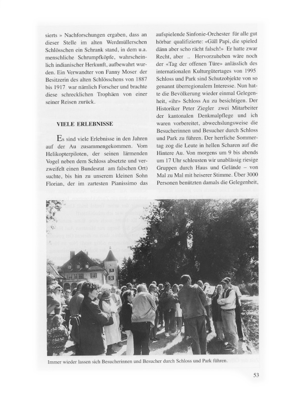 Neben den Kursen nahm bald auch die Zahl der repräsentativen Veranstaltungen zu. An unzähligen Wochenenden galt es Gäste zu begrüssen oder die musikalisch untermalte Geschichte der Au zu erzählen. Das wäre ohne Unterstützung und Verständnis von Frau und Kindern nicht möglich gewesen. All das dabei Erlebte chronologisch aufzuzählen, würde viele Seiten füllen. Hier einige Rosinen. Da ist einmal die lustige Begebenheit mit seiner Exzellenz, dem Botschafter von ... Er lud ins Schloss Au zum Nationalfeiertag seines Landes. Solche Veranstaltungen waren unserem Budget sehr zuträglich. Die Instruktion des zackigen Botschaftssekretärs lautete, als «Schlossherr» die Gäste zu begrüssen und dann den Auftritt des Herrn Botschafters als «Seine Exzellenz, der Herr Botschafter Dr. John ... bittet um Ihre Aufmerksamkeit» anzukündigen. Mehrmals wurde ich darauf hingewiesen, auf keinen Fall in der Ankündigung wie aber auch im Gespräch mit dem Botschafter die Anrede «Seine Exzellenz» zu unterlassen. Diese Anweisung ging mir zwar arg gegen den Strich, aber wirtschaftliches Denken war mir keineswegs fremd! Kurz vor Beginn der Veranstaltung kam ein sehr netter Herr auf mich zu und erkundigte sich in gebrochenem Deutsch nach irgendetwas. Am Schluss des freundlichen Gesprächs fragte ich ihn, ob es wirklich den diplomatischen Gepflogenheiten entspreche, einen Botschafter mit den erwähnten Floskeln ansprechen zu müssen. Dieser meinte «Sagen sie ihm doch einfach John, dann hat er ganz bestimmt Freude», lachte und ging weg. Sie haben richtig geraten! Ich aber merkte es erst auf der Bühne. Es war der Botschafter gleich selbst. Sein (über)korrekter Sekretär hätte mich am liebsten von der Bühne weggezaubert, als ich «Seine Exzellenz» vor rund 500 Personen als «Lieber John» ankündigte.