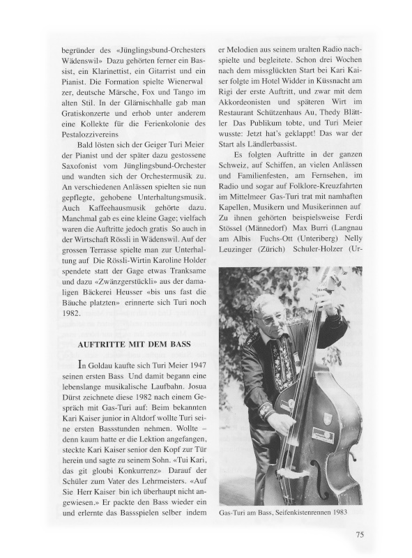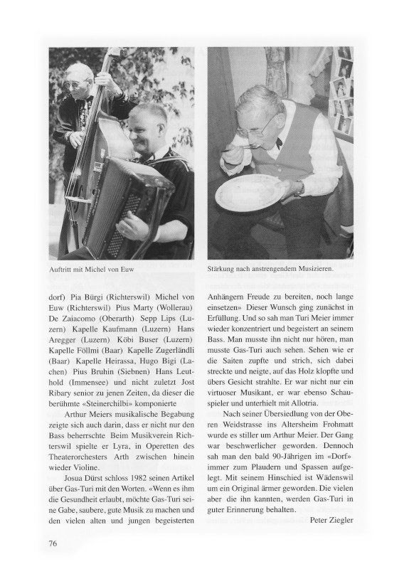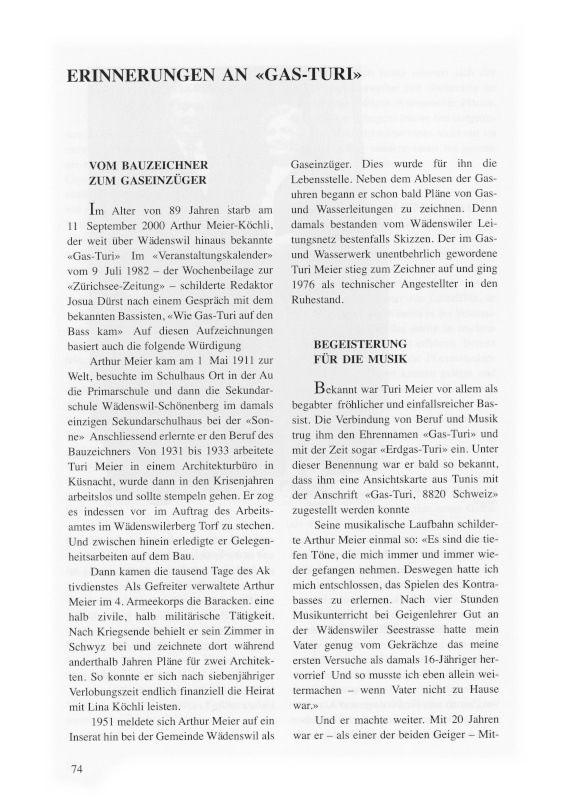Im Alter von 89 Jahren starb am 11. September 2000 Arthur Meier-Köchli, der weit über Wädenswil hinaus bekannte «Gas-Turi». Im Veranstaltungskalender von 1982 – der Wochenbeilage zur «Zürichsee-Zeitung» - schilderte Redaktor Josua Dürst nach einem Gespräch mit dem bekannten Bassisten, «Wie Gas-Turi auf den Bass kam». Auf diesen Aufzeichnungen basiert auch die folgende Würdigung.