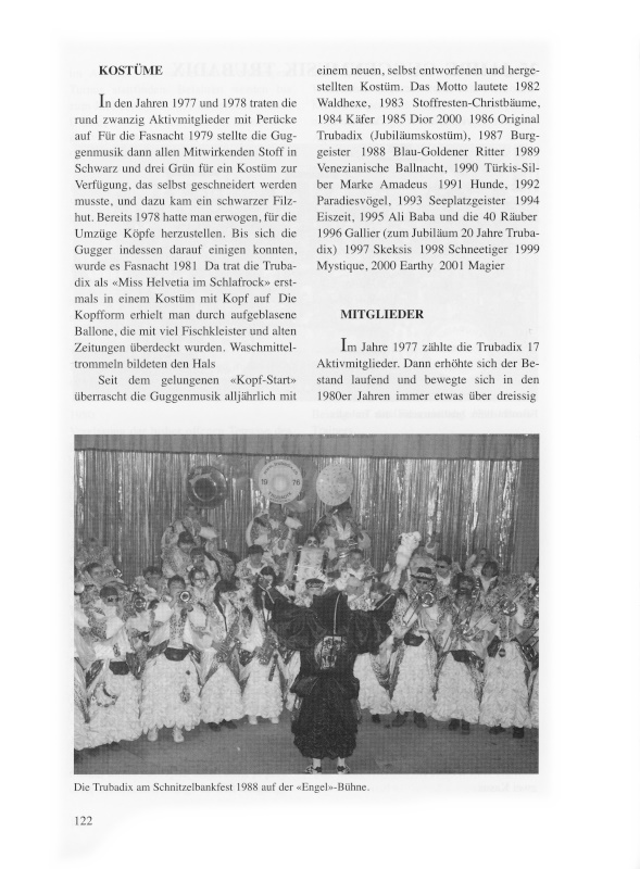 Seit dem gelungenen «Kopf-Start» überrascht die Guggenmusik alljährlich mit einem neuen, selbst entworfenen und hergestellten Kostüm. Das Motto lautete 1982 Waldhexe, 1983 Stoffresten-Christbäume, 1984 Käfer, 1985 Dior 2000, 1986 Original Trubadix (Jubiläumskostüm), 1987 Burggeister, 1988 Blau-Goldener Ritter, 1989 Venezianische Ballnacht, 1990 Türkis-Silber Marke Amadeus, 1991 Hunde, 1992 Paradiesvögel, 1993 Seeplatzgeister, 1994 Eiszeit, 1995 Ali Baba und die 40 Räuber, 1996 Gallier (zum Jubiläum 20 Jahre Trubadix), 1997 Skeksis, 1998 Schneetiger, 1999 Mystique, 2000 Earthy, 2001 Magier.