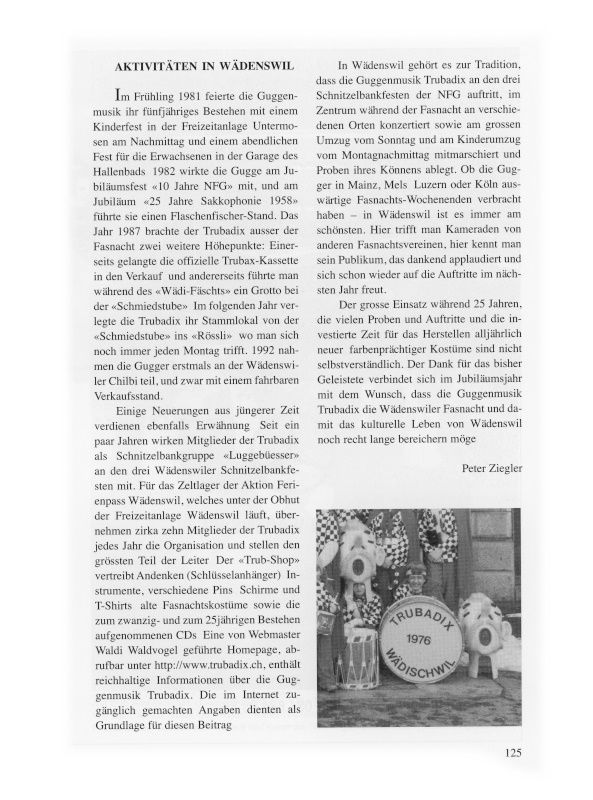 Wie vielseitig die Aktivitäten der Guggenmusik Trubadix auch ausserhalb von Wädenswil sind, belegt beispielsweise der im Internet publizierte Kalender des Jahres 2000. Da gab es Auftritte in Bäch, Rüschlikon, Galgenen, Einsiedeln, Siebnen, Hirzel, Uznach, Kaltbrunn, Pfäffikon SZ, Horgen und dazu je ein Wochenende im deutschen Haslach und in Italien.
