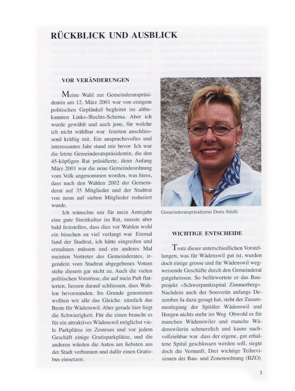 Meine Wahl zur Gemeinderatspräsidentin am 12. März 2001 war von einigem politischen Geplänkel begleitet im altbekannten Links-/Rechts-Schema. Aber ich wurde gewählt und auch jene, für welche ich nicht wählbar war, feierten anschliessend kräftig mit. Ein anspruchsvolles und interessantes Jahr stand mir bevor. Ich war die letzte Gemeinderatspräsidentin, die den 45-köpfigen Rat präsidierte, denn Anfang März 2001 war die neue Gemeindeordnung vom Volk angenommen worden, was hiess, dass nach den Wahlen 2002 der Gemeinderat auf 35 Mitglieder und der Stadtrat von 9 auf 7 Mitglieder reduziert wurde.