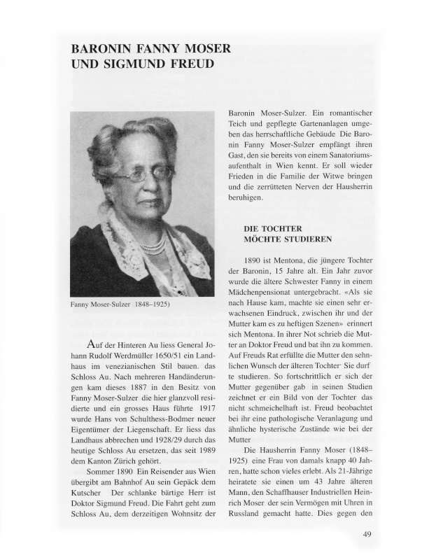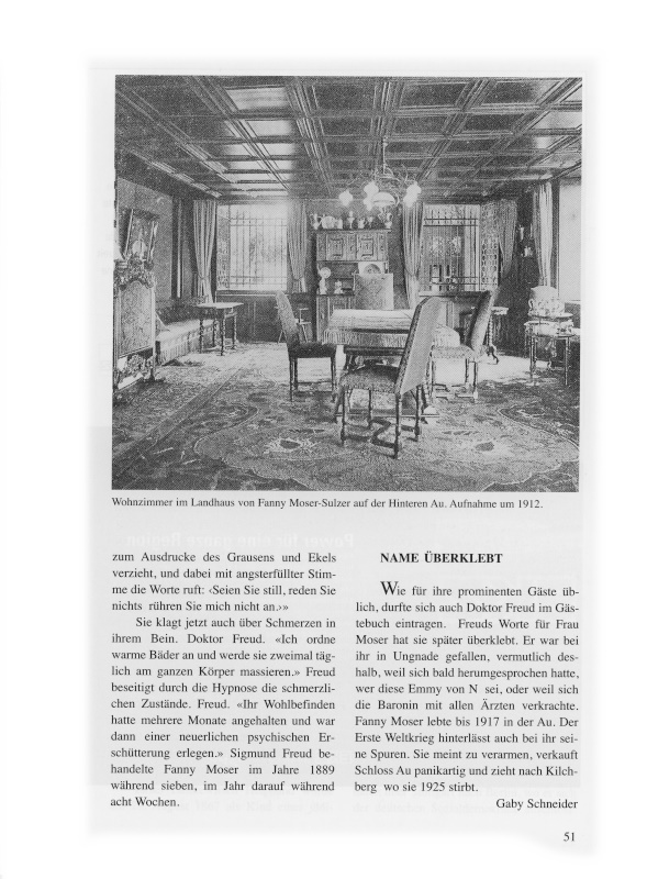Wie für ihre prominenten Gäste üblich durfte sich auch Doktor Freud im Gästebuch eintragen. Freuds Worte für Frau Moser hat sie später überklebt. Er war bei ihr in Ungnade gefallen, vermutlich deshalb, weil sich bald herumgesprochen hatte, wer diese Emmy von N. sei, oder weil sich die Baronin mit allen Ärzten verkrachte. Fanny Moser lebte bis 1917 in der Au. Der Erste Weltkrieg hinterlässt auch bei ihr seine Spuren. Sie meint zu verarmen, verkauft Schloss Au panikartig und zieht nach Kilchberg, wo sie 1925 stirbt.
