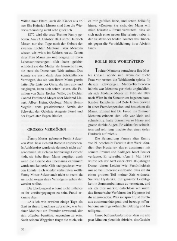 Tochter Mentona betrachtete ihre Mutter kritisch, nervte sich, wenn die reiche Frau vor Armen die Wohltäterin spielte. In diesem schwierigen Mutter-Tochter-Verhältnis war Mentona gar nicht unglücklich, als sich Madame Moser im Frühjahr 1889 nach Wien in ein Sanatorium begeben hatte. Kinder, Erzieherin und Zofe lebten derweil in einer Fremdenpension und besuchten die Mama. Einmal trat Dr. Freud ins Zimmer: Mentona erinnert sich: «Er war klein und schmächtig, hatte blauschwarze Haare und grosse dunkle Augen. Er wirkte fast schüchtern und sehr jung, machte aber einen tiefen Eindruck auf mich.»