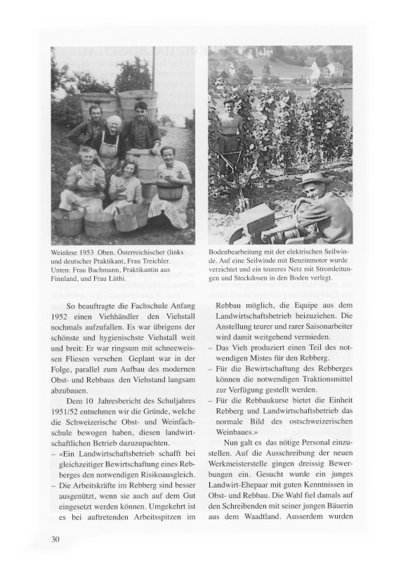 Nun galt es das nötige Personal einzustellen. Auf die Ausschreibung der neuen Werkmeisterstelle gingen dreissig Bewerbungen ein. Gesucht wurde ein junges Landwirt-Ehepaar mit guten Kenntnissen in Obst- und Rebbau. Die Wahl fiel damals auf den Schreibenden mit seiner jungen Bäuerin aus dem Waadtland. Ausserdem wurden noch zwei Praktikanten eingestellt, die auch zum Haushalt gehörten. Es war je ein Bauernsohn aus Deutschland und aus Österreich. In dieser personellen Besetzung begann der schuleigene Lehrbetrieb, mit dem Viehstand Wiesen und Weiden zu nutzen und den weiteren Ausbau des Schulrebberges voranzutreiben.