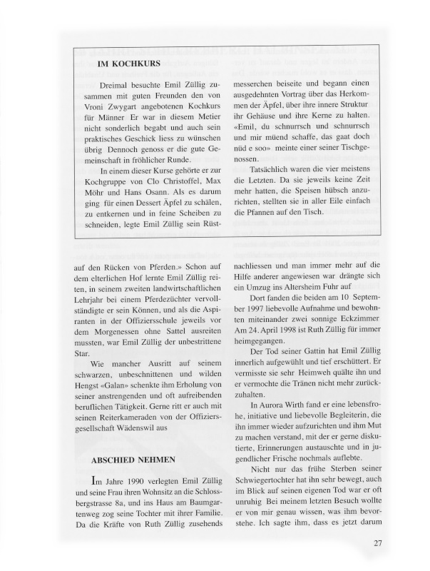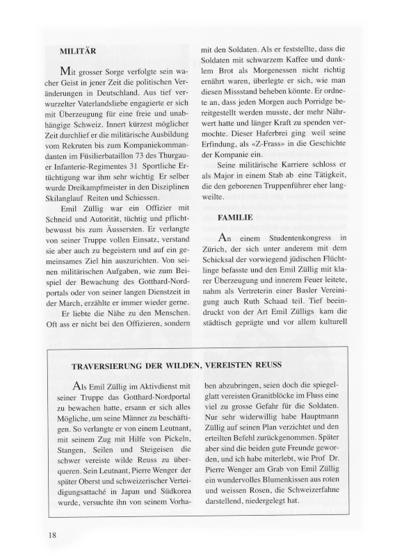 Traversierung der wilden, vereisten ReussAls Emil Züllig im Aktivdienst mit seiner Truppe das Gotthard-Nordportal zu bewachen hatte, ersann er sich alles Mögliche, um seine Männer zu beschäftigen. So verlangte er von einem Leutnant, mit seinem Zug mit Hilfe von Pickeln, Stangen, Seilen und Steigeisen die schwer vereiste wilde Reuss zu überqueren. Sein Leutnant, Pierre Wenger, der später Oberst und schweizerischer Verteidigungsattaché in Japan und Südkorea wurde, versuchte ihn von seinem Vorhaben abzubringen, seien doch die spiegelglatt vereisten Granitblöcke im Fluss eine viel zu grosse Gefahr für die Soldaten. Nur sehr widerwillig habe Hauptmann Züllig auf seinen Plan verzichtet und den erteilten Befehl zurückgenommen. Später aber sind die beiden gute Freunde geworden, und ich habe miterlebt, wie Pierre Wenger am Grab von Emil Züllig ein wundervolles Blumenkissen aus roten und weissen Rosen, die Schweizerfahne darstellend, niedergelegt hat. |