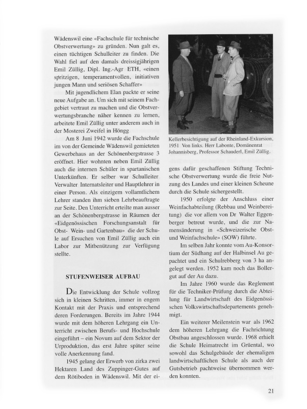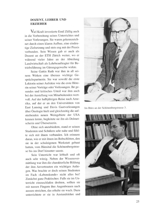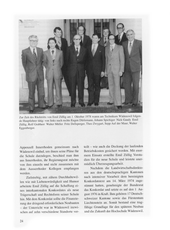 24 Zur Zeit des Rücktritts von Emil Züllig am 1. Oktober 1978 waren am Technikum Wädenswil folgende Hauptlehrer tätig: von links nach rechts Eugen Dürlemann, Johann Spichiger, Nick Gaudy, Emil Züllig, Rolf Grabherr, Walter Müller, Fritz Dellsperger, Theo Zwygart, Sepp Auf der Maur, Walter Eggenberger.