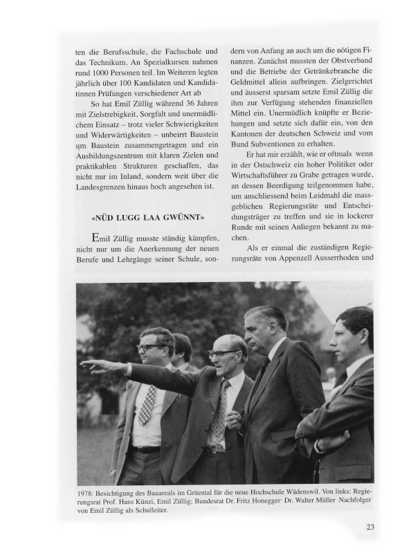 23 1978: Besichtigung des Bauareals im Grüntal für die neue Hochschule Wädenswil. Von links: Regierungsrat Prof. Hans Künzi; Emil Züllig; Bundesrat Dr. Fritz Honegger; Dr. Walter Müller, Nachfolger von Emil Züllig als Schulleiter.