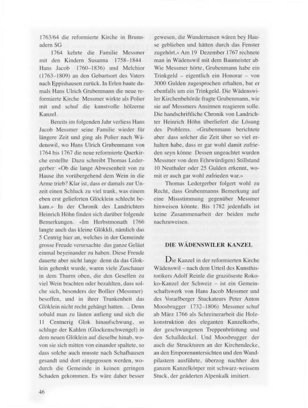 Auf 144 Seiten würdigen Thomas Ledergerber und Jürg Davatz in ihrer auch als Sonderdruck erschienenen Schrift auf eindrückliche Weise Leben und Werk des bisher weitgehend unbekannten Baumeisters und Zimmermanns Hans Jacob Messmer, dem auch die formschöne Kanzel in der reformierten Kirche Wädenswil zu verdanken ist. Nur zeitweise war es Messmer vergönnt, aus dem Schatten der berühmteren Grubenmann zu treten. Dennoch hinterliess er ein bauliches Erbe, das bis heute von beachtenswerter Gestaltungskraft zeugt.