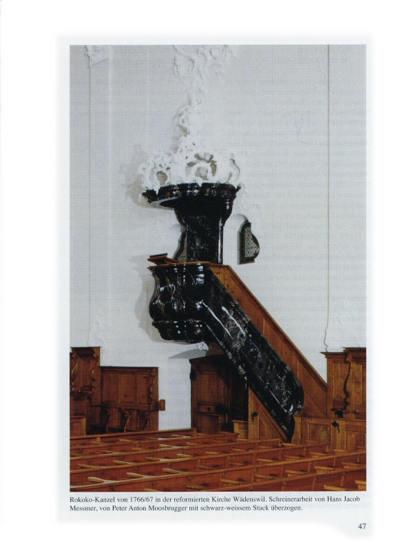47 Rokoko-Kanzel von 1766/67 in der reformierten Kirche Wädenswil. Schreinerarbeit von Hans Jacob Messmer, von Peter Anton Moosbrugger mit schwarz-weissem Stuck überzogen.