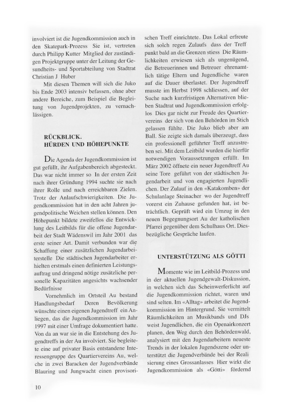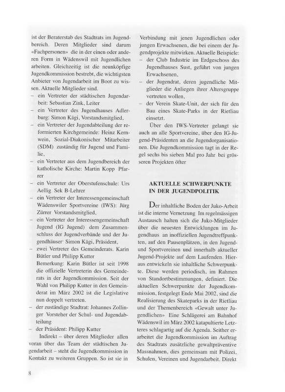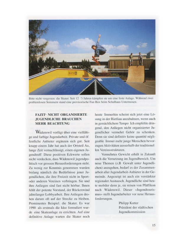 15 Bitte nicht vergessen: die Skater. Seit 12 (!) Jahren kämpfen sie um eine feste Anlage. Während zwei problemlosen Sommern stand eine provisorische Fun Box beim Schulhaus Untermosen.