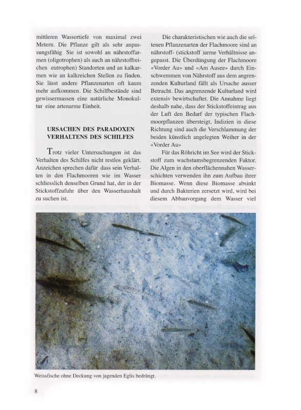 Paradox ist das Verhalten des Schilfes am Land und im Wasser am Beispiel der Naturschutzgebiete der Halbinsel Au. In den Flachmooren gedeiht es besser als für einen gesunden Pflanzenbestand erwünscht ist. Es verdrängt dort die nährstoffempfindlichen Seggen und die zwischen ihnen gedeihende Fülle von Sumpfpflanzen. Im Wasser hat es Mühe zum Überleben, obwohl der Wasserkörper als gesund bezeichnet wird.