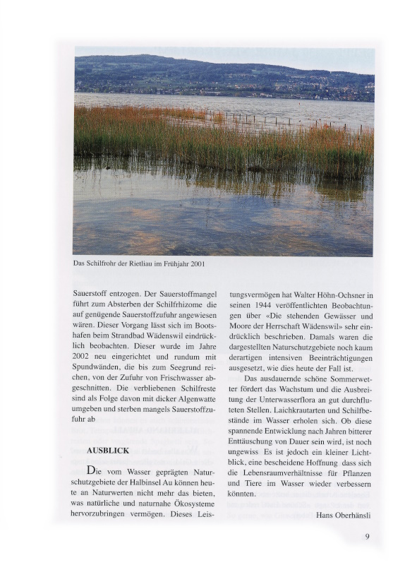 Die vom Wasser geprägten Naturschutzgebiete der Halbinsel Au können heute an Naturwerten nicht mehr das bieten, was natürliche und naturnahe Ökosysteme hervorzubringen vermögen. Dieses Leistungsvermögen hat Walter Höhn-Ochsner in seinen 1942 veröffentlichten Beobachtungen über «Die stehenden Gewässer und Moore der Herrschaft Wädenswil» sehr eindrücklich beschrieben. Damals waren die dargestellten Naturschutzgebiete noch kaum derartigen intensiven Beeinträchtigungen ausgesetzt, wie dies heute der Fall ist. Ob es je wieder zu einer dauerhaften Trendumkehr kommen wird, ist unsicher.