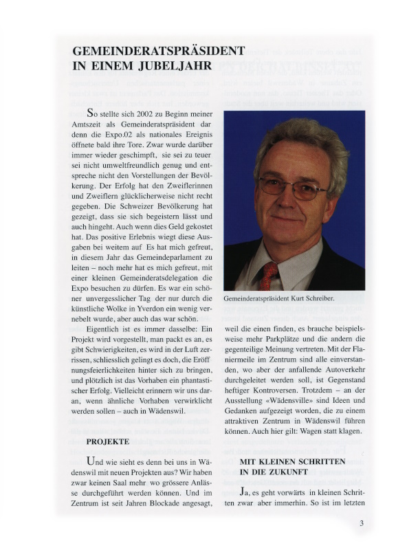 So stellte sich 2002 zu Beginn meiner Amtszeit als Gemeinderatspräsident dar, denn die Expo 02 als nationales Ereignis öffnete bald ihre Tore. Zwar wurde darüber immer wieder geschimpft, sie sei zu teuer, sei nicht umweltfreundlich genug und entspreche nicht den Vorstellungen der Bevölkerung. Der Erfolg hat den Zweiflerinnen und Zweiflern glücklicherweise nicht recht gegeben. Die Schweizer Bevölkerung hat gezeigt, dass sie sich begeistern lässt und auch hingeht. Auch wenn dies Geld gekostet hat. Das positive Erlebnis wiegt diese Ausgaben bei weitem auf. Es hat mich gefreut, in diesem Jahr das Gemeindeparlament zu leiten – noch mehr hat es mich gefreut, mit einer kleinen Gemeinderatsdelegation die Expo besuchen zu dürfen. Es war ein schöner, unvergesslicher Tag, der nur durch die künstliche Wolke in Yverdon ein wenig vernebelt wurde, aber auch das war schön.
