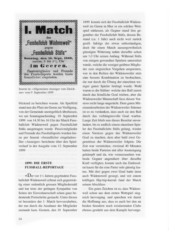 «Der vor 1½ Jahren gegründete Fussballclub Wädensweil erfreut sich gegenwärtig einer ordentlich grossen Mitgliederzahl und hat trotz der geringen Sympathie von Seiten der Einwohnerschaft schon ganz bedeutende Fortschritte gemacht. Unter diesen ist besonders der 1. Match hervorzuheben, der nur durch die Ausdauer der Mitglieder zustande kam. Gestern, den 10. September 1899, konnte sich der Fussballclub Wädensweil im Geren in Hier in ein solches Wettspiel einlassen. Als Gegner stand ihm gegenüber der Fussballclub Stäfa, dessen Bestand (ca. 1 Jahr) auch nicht weit zurück greift. Infolge der etwas unbeständigen, doch für einen Match aussergewöhnlich günstigen Witterung nahm derselbe schon um ½3 Uhr seinen Anfang. Während Stäfa von einigen gewandten Spielern unterstützt wurde, welche die weniger geübten Mitglieder zum siegreichen Vorgehen anspornten, war in den Reihen der Wädensweiler stets eine bessere Kombination zu beobachten, die nur durch die Übung der einzelnen weniger guten Spieler bedingt wurde. Wohl waren es die Stäfner, welche den Ball zuerst durch das feindliche Goal trieben, aber die Wädensweiler Mannschaft liess diesen Vorstoss nicht lange ungerächt. Dem guten Miteinanderarbeiten der Wädensweiler Stürmer ist es zu verdanken, dass auch sie den Ball durch das verhängnisvolle Goal warfen. Lange Zeit blieb nun dieses Resultat unverändert, bis es endlich einem einzelnen Spieler des Fussballclubs Stäfa gelang, wieder einen Vorstoss gegen das Wädensweiler Goal zu machen, dem aber bald zwei Gegenstösse der Wädensweiler folgten. Die Zeit war verstrichen, zweimal 40 Minuten hatten beide Parteien mit aller Anstrengung gekämpft und da, wie vorauszusehen war, beide Gegner angenähert über dieselbe Kraft verfügten, konnte auch das Endresultat kaum für die eine Partei sehr günstig lauten. Mit drei gegen zwei Goal hatte denn auch Wädensweil gesiegt, und mit einem kräftigen Hip-hip-hurrah fand der Match seinen Abschluss.