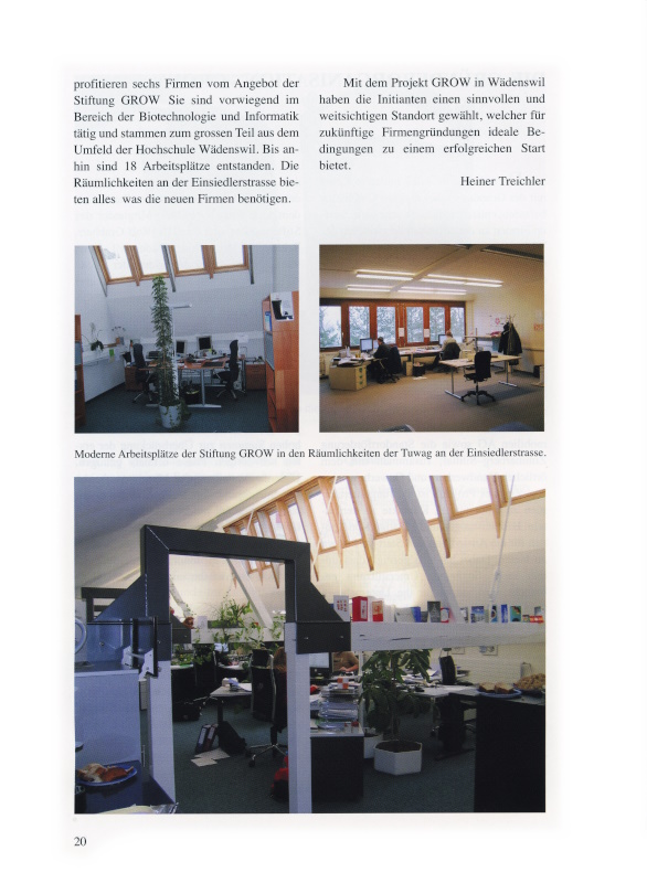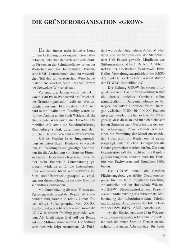 Vor rund drei Jahren wurde unter dem Kürzel GROW in Wädenswil das Projekt einer Gründerorganisation realisiert. Was anfänglich aus einer Idee entstand, setzte sich bald in die Realität um. Beteiligt waren daran von Anfang an die Stadt Wädenswil, die Hochschule Wädenswil, die TUWAG Immobilien AG sowie die Standortförderung Zimmerberg – Sihltal, zusammen mit dem örtlichen Handwerker- und Gewerbeverein.