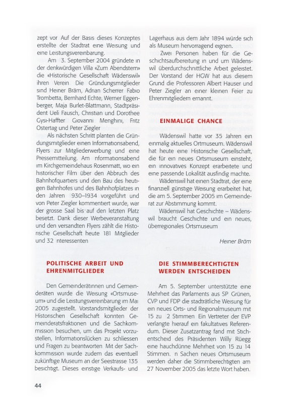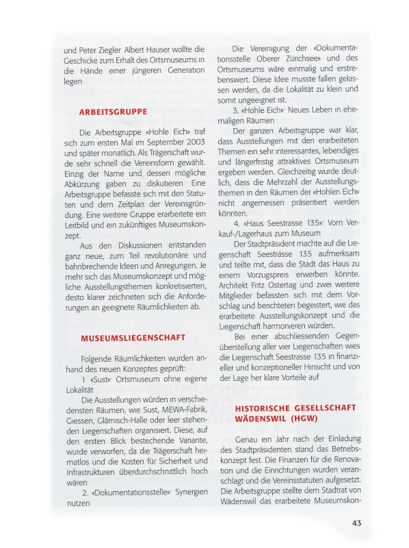 Wädenswil hatte vor 35 Jahren ein einmalig aktuelles Ortmuseum. Wädenswil hat heute eine Historische Gesellschaft, die für ein neues Ortsmuseum einsteht, ein innovatives Konzept erarbeitete und eine passende Lokalität ausfindig machte.