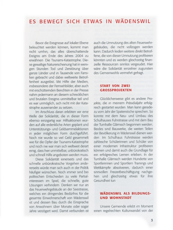 Bevor die Ereignisse auf lokaler Ebene beleuchtet werden können, kommt man nicht umhin, das alles überschattende Ereignis am Ende des Jahres 2004 zu erwähnen: Die Tsunami-Katastrophe. Diese gewaltige Naturerscheinung hat in wenigen Stunden Tod und Zerstörung über ganze Länder und in Tausende von Familien gebracht und dabei weltweite Betroffenheit ausgelöst. Mit Hilfe der Medien, insbesondere der Fernsehbilder, aber auch mit erschütternden Berichten in der Presse nahm jedermann an diesem schrecklichen und brutalen Ereignis unmittelbar teil und es war unmöglich, sich nicht mit der Katastrophe auseinander zusetzen.