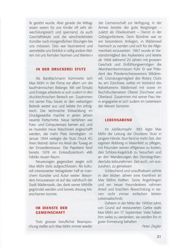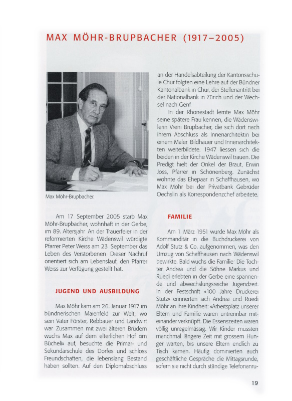 Im Jubiläumsjahr 1983 legte Max Möhr die Leitung der Druckerei Stutz in jüngere Hände. Nun fand er mehr Zeit, den eigenen Rebberg in Maienfeld zu pflegen, mit Freunden seinen «Pilgerwii» zu kosten, den Schloss-Kegelclub zu besuchen und an den Wanderungen des Dienstag-Wanderclubs teilzunehmen. Zeit auch um auszuruhen, zu geniessen.
