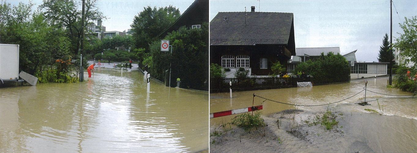 Anhaltende starke Regenfälle führten am 22. August 2005 in weiten Teilen der Schweiz zu Überschwemmungen mit grossen Schäden. Was waren die Ursachen? Die Klimaerwärmung heizte das Mittelmeer stark auf; Meerwasser verdunstete, und es bildeten sich Wolken. Ein Tief lenkte die feuchte Luft aus dem Mittelmeerraum in die Schweiz. Ein Hoch im Osten hinderte das Tief daran, abzuziehen; es blieb über den Alpen hängen. Die Alpen zwangen die feuchte Luft zum Aufsteigen; die Luft kühlte sich ab, und es fiel Regen. Weil immer mehr Wolken aufzogen, hielt der Regen an, Bäche, Flüsse und Seen traten über die Ufer. In Wädenswil war die Lage weniger dramatisch als in der Innerschweiz, in Weesen, Brienz oder Bern. Doch auch hier wurden Bäche zu reissenden Fluten. Unterhalb der Zugerstrasse trat der Gulmenbach über die Ufer und suchte sich zwischen Musli- und Büelenstrasse ein neues Bett; der Reidbach setzte das halbe Giessendelta unter Wasser. Philippe Klein hielt die Überschwemmungen in Wädenswil mit seiner Kamera fest.