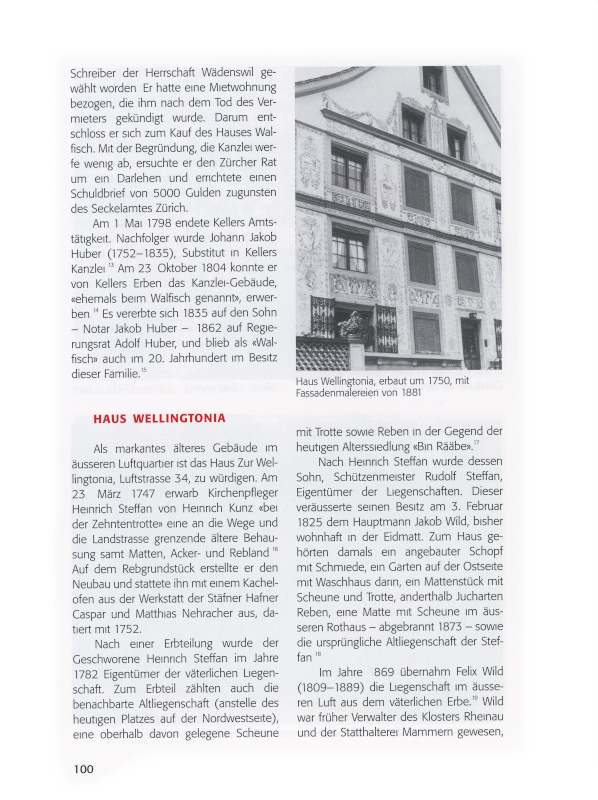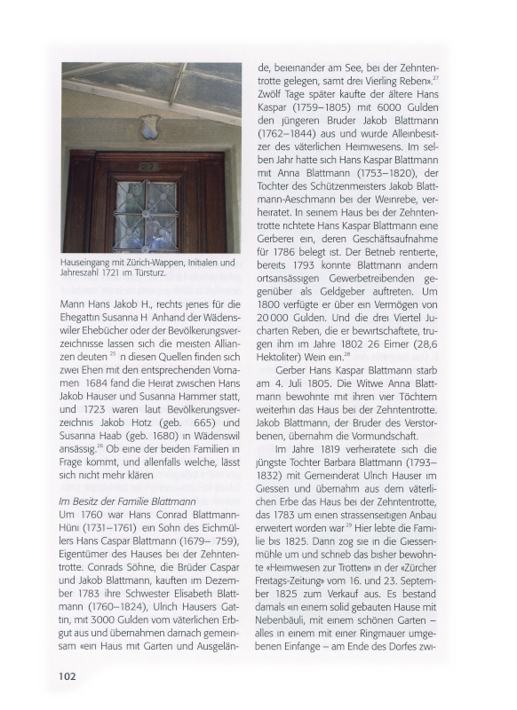 Die Jahreszahl 1721 wurde auf dem Sturz der zur Luftstrasse orientierten Haustüre überliefert, zusammen mit den beidseits des Zürcher Standeswappens angeordneten Initialen HIH und SAH. Auffällig ist die Verwendung des Zürich-Wappens im Türsturz. Denn an Wädenswiler Häusern befinden sich sonst Allianzwappen: das Familienwappen des Mannes und der Ehefrau. Als Gebäude der Landvogtei kommt das 1721 erbaute Haus nicht in Frage. Die Initialen bezeichnen eine Allianz, also links das Kürzel für den Mann Hans Jakob H., rechts jenes für die Ehegattin Susanna H. Anhand der Wädenswiler Ehebücher oder der Bevölkerungsverzeichnisse lassen sich die meisten Allianzen deuten.25 In diesen Quellen finden sich zwei Ehen mit den entsprechenden Vornamen: 1684 fand die Heirat zwischen Hans Jakob Hauser und Susanna Hammer statt, und 1723 waren laut Bevölkerungsverzeichnis Jakob Hotz (geb. 1665) und Susanna Haab (geb. 1680) in Wädenswil ansässig.26 Ob eine der beiden Familien in Frage kommt, und allenfalls welche, lässt sich nicht mehr klären.