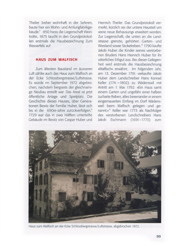 Am 1. Mai 1798 endete Kellers Amtstätigkeit. Nachfolger wurde Johann Jakob Huber (1752–1835), Substitut in Kellers Kanzlei.13 Am 23. Oktober 1804 konnte er von Kellers Erben das Kanzlei-Gebäude, «ehemals beim Walfisch genannt», erwerben.14 Es vererbte sich 1835 auf den Sohn – Notar Jakob Huber –, 1862 auf Regierungsrat Adolf Huber, und blieb als «Walfisch» auch im 20. Jahrhundert im Besitz dieser Familie.15