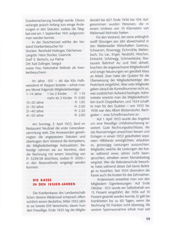 Die Landwirte Jakob Vetterli, Lange Stege, und Heinrich Brändli im Oberen Leihof waren der Ansicht, dass für die bäuerliche Bevölkerung eine eigene Krankenkasse gegründet werden sollte. Der Landwirtschaftliche Verein griff die Idee auf, und an seiner Generalversammlung vom 22. März 1931 wurde die «Krankenkasse des Landwirtschaftlichen Vereins Wädenswil» gegründet. Gemäss den an diesem Tag genehmigten Statuten nahm die konfessionell neutrale Krankenkasse in Wädenswil wohnhafte Personen ab dem vollendeten ersten bis zum fünfzigsten Lebensjahr auf. Der Vorstand sollte aus fünf Mitgliedern bestehen. Das Präsidium der Krankenkasse musste der jeweilige Präsident des Landwirtschaftlichen Vereins innehaben. Der Vorstand des Landwirtschaftlichen Vereins ernannte den Aktuar; die Generalversammlung der Kasse wählte den Quästor und den Beisitzer. Gemäss Beschluss der Gründungsversammlung wurde den Mitgliedern freie Arztwahl zugestanden.