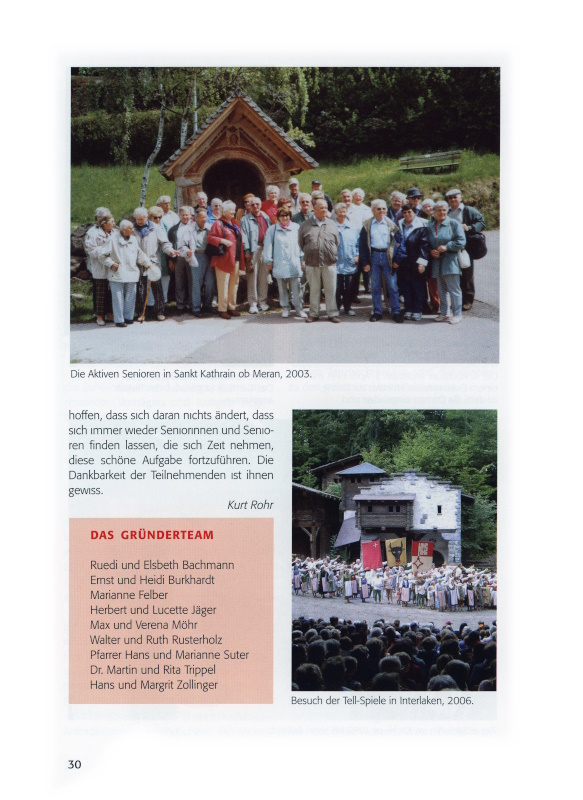 Für die Mitglieder des Leiterteams ist sowohl die Zusammenarbeit im Team als auch die Organisation von Veranstaltungen eine schöne und erfüllende Tätigkeit. Immer wieder hört man es und spürt es auch, dass man mit dem breitgefächerten Freizeitangebot viel Freude bereiten kann. Dieses Wissen gibt den Mitgliedern des Leiterteams Genugtuung und motiviert sie, das von Ruedi und Elsbeth Bachmann und ihren damaligen Freunden, von denen inzwischen leider einige verstorben sind, vor 20 Jahren begonnene Werk in ihrem Sinn und Geist weiterzuführen. Es bleibt zu hoffen, dass sich daran nichts ändert, dass sich immer wieder Seniorinnen und Senioren finden lassen, die sich Zeit nehmen, diese schöne Aufgabe fortzuführen. Die Dankbarkeit der Teilnehmenden ist ihnen gewiss.