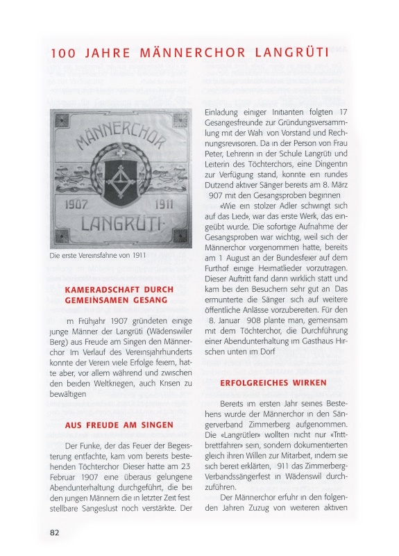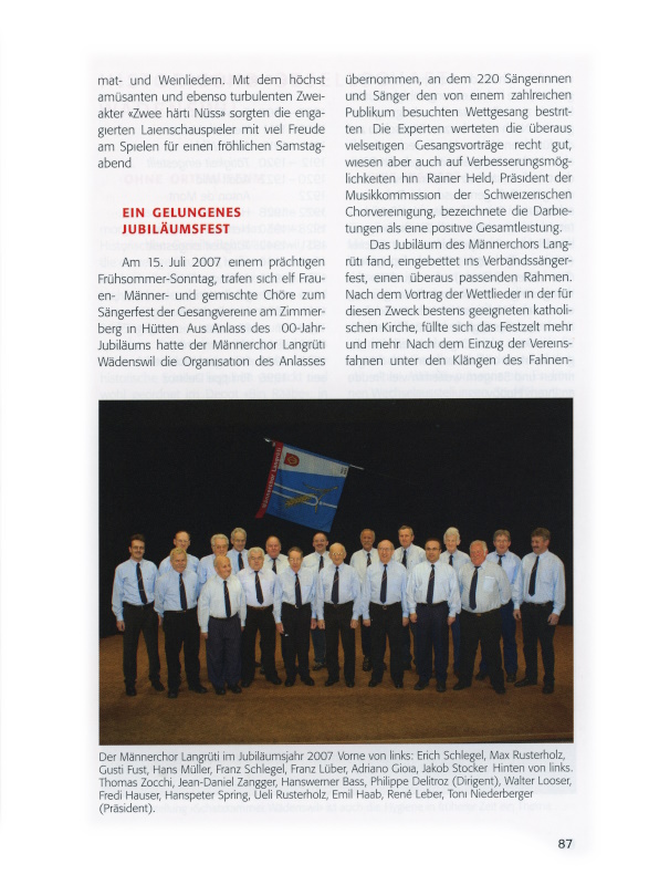 87 Der Männerchor Langrüti im Jubiläumsjahr 2007. Vorne von links: Erich Schlegel, Max Rusterholz, Gusti Fust, Hans Müller, Franz Schlegel, Franz Lüber, Adriano Gioia, Jakob Stocker. Hinten von links: Thomas Zocchi, Jean-Daniel Zangger, Hanswerner Bass, Pilippe Delitroz (Dirigent), Walter Looser, Fredi Hauser, Hanspeter Spring, Ueli Rusterholz, Emil Haab, René Leber, Toni Niederberger (Präsident).