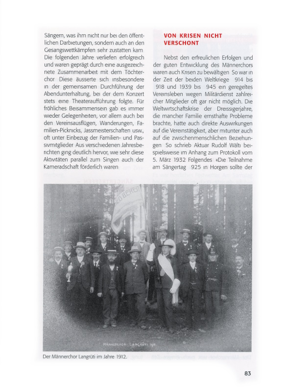 Nebst den erfreulichen Erfolgen und der guten Entwicklung des Männerchors waren auch Krisen zu bewältigen. So war in der Zeit der beiden Weltkriege 1914 bis 1918 und 1939 bis 1945 ein geregeltes Verseinsleben wegen Militärdienst zahlreicher Mitglieder oft gar nicht möglich. Die Weltwirtschaftskrise der Dreissigerjahre, die mancher Familie ernsthafte Probleme brachte, hatte auch direkte Auswirkungen auf die Vereinstätigkeit, aber mitunter auch auf die zwischenmenschlichen Beziehungen. So schrieb Aktuar Rudolf Wälti beispielsweise im Anhang zum Protokoll vom 5. März 1932 folgendes: «Die Teilnahme am Sängertag 1925 in Horgen sollte der Abschluss einer guten Zeit unseres Vereins sein. Obwohl noch einige Veranstaltungen folgten, lebten wir seitdem im Zeichen einer Vereinskrise, deren Ursachen ich hier verschweige. Seit längerer Zeit ist unsere Gesangstätigkeit lahm gelegt. Heute haben wir auch im Beruf Krisen zu überstehen, wie wir sie zuvor nie gekannt hatten. Mit Bangen sehen wir der Zukunft entgegen. Dessen ungeachtet bekunde ich hier den sehnlichsten Wunsch, dass sich unser Verein wieder zu einem leistungsfähigen Männerchor gestalte und dass wir einen energischen, seiner Aufgabe bewussten Leiter finden werden.»
