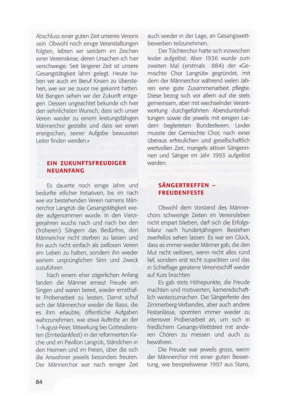 Der Töchterchor hatte sich inzwischen leider aufgelöst. Aber 1936 wurde zum zweiten Mal (erstmals 1884) der «Gemischte Chor Langrüti» gegründet, mit dem der Männerchor während vielen Jahren eine gute Zusammenarbeit pflegte. Diese bezog sich vor allem auf die stets gemeinsam, aber mit wechselnder Verantwortung durchgeführten Abendunterhaltungen sowie die jeweils mit einigen Liedern begleiteten Bundesfeiern. Leider musste der Gemischte Chor, nach einer überaus erfreulichen und gesellschaftlich wertvollen Zeit, mangels aktiver Sängerinnen und Sänger im Jahr 1993 aufgelöst werden.