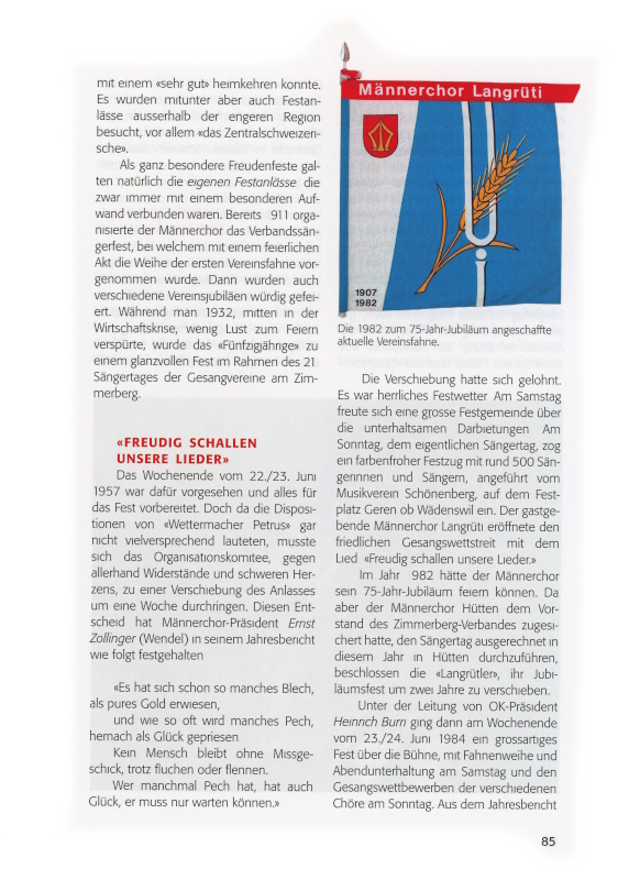 Im Jahr 1982 hätte der Männerchor sein 75-Jahr-Jubiläum feiern können. Da aber der Männerchor Hütten dem Vorstand des Zimmerberg-Verbandes zugesichert hatte, den Sängertag ausgerechnet in diesem Jahr in Hütten durchzuführen, beschlossen die «Langrütler», ihr Jubiläumsfest um zwei Jahre zu verschieben.