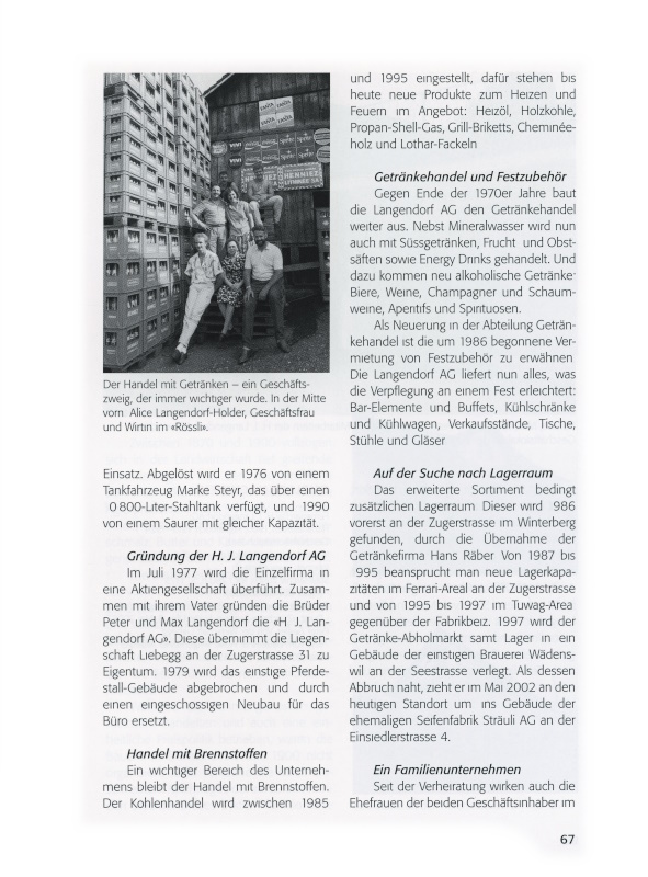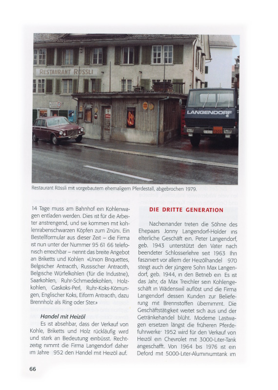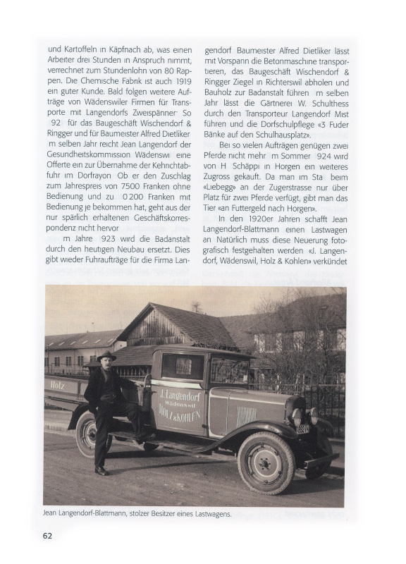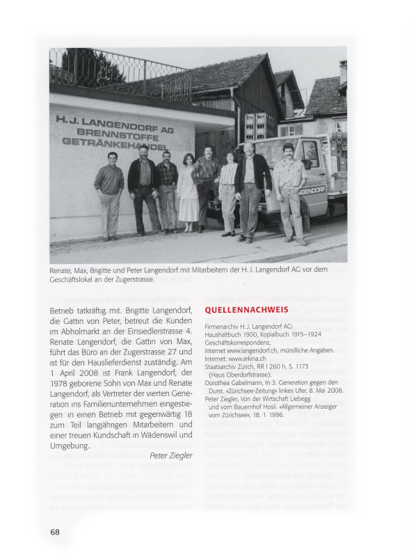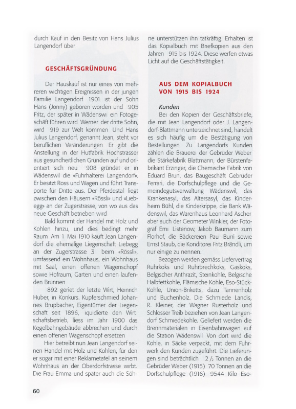 Bezogen werden gemäss Liefervertrag Ruhrkoks und Ruhrbrechkoks, Gaskoks, Belgischer Anthrazit, Steinkohle, Belgische Halbfettkohle, Flämische Kohle, Eso-Stück-Kohle, Union-Briketts, dazu Tannenholz und Buchenholz. Die Schmiede Landis, R. Kleiner, der Wagner Rusterholz und Schlosser Treib beziehen von Jean Langendorf Schmiedekohle. Geliefert werden die Brennmaterialen in Eisenbahnwagen auf die Station Wädenswil. Von dort wird die Kohle, in Säcke verpackt, mit dem Fuhrwerk den Kunden zugeführt. Die Lieferungen sind beträchtlich: 12½ Tonnen an die Gebrüder Weber (1915), 70 Tonnen an die Dorfschulpflege (1916), 9544 Kilo Eso-Stück-Kohle an Jacob Hauser zur «Krone» (1918).