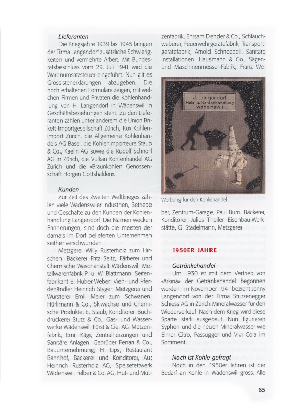 Wer sind die Lieferanten von Holz und Kohlen? Auch darüber gibt das Kopialbuch einige Aufschlüsse. J. Langendorf steht in Geschäftsverkehr mit der Schweizerischen Brikett-Import-Gesellschaft in Zürich, der Kohleagentur E. Boehm in Zollikon ZH, mit dem Kohlenhändler Rudolf Schnorf in Zürich, der Kohlenunion Seldner & Cie. in Basel, der Kohlenzentrale AG Basel, mit der Hausbrandzentrale Zürich und mit dem Gaswerk Wädenswil. Tannen- und Buchenholz am Ster oder per Ring bezieht Kohlenhändler Langendorf von A. Bosshardt in Einsiedeln, A. Tschümperlin in Alptal, H. Schiess in Basel, von Johann Schwyter in Siebnen, Josef Rennhaus in Rorschach und von H. Spetzmann & Cie. in St. Gallen.