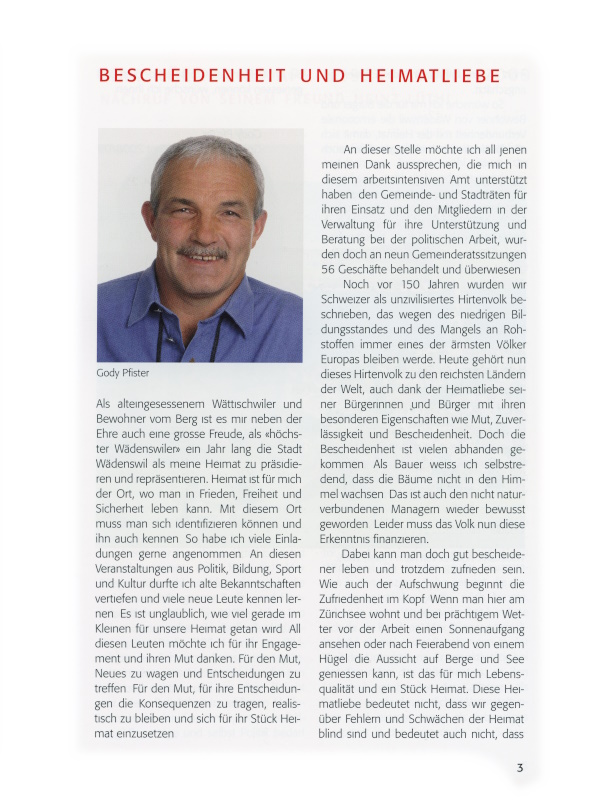 Als alteingesessener Wättischwiler und Bewohner vom Berg ist es neben der Ehre auch eine grosse Freude, als «höchster Wädenswiler» ein Jahr lang die Stadt Wädenswil als meine Heimat zu präsidieren und repräsentieren. Heimat ist für mich der Ort, wo man in Frieden, Freiheit und Sicherheit leben kann. Mit diesem Ort muss man sich identifizieren können und ihn auch kennen. So habe ich viele Einladungen gerne angenommen. An diesen Veranstaltungen aus Politik, Bildung, Sport und Kultur durfte ich alte Bekanntschaften vertiefen und viele neue Leute kennen lernen. Es ist unglaublich, wie viel gerade im Kleinen für unsere Heimat getan wird. All diesen Leuten möchte ich für ihr Engagement und ihren Mut danken. Für den Mut, Neues zu wagen und Entscheidungen zu treffen. Für den Mut, für ihre Entscheidungen die Konsequenzen zu tragen, realistisch zu bleiben und sich für ihr Stück Heimat einzusetzen.