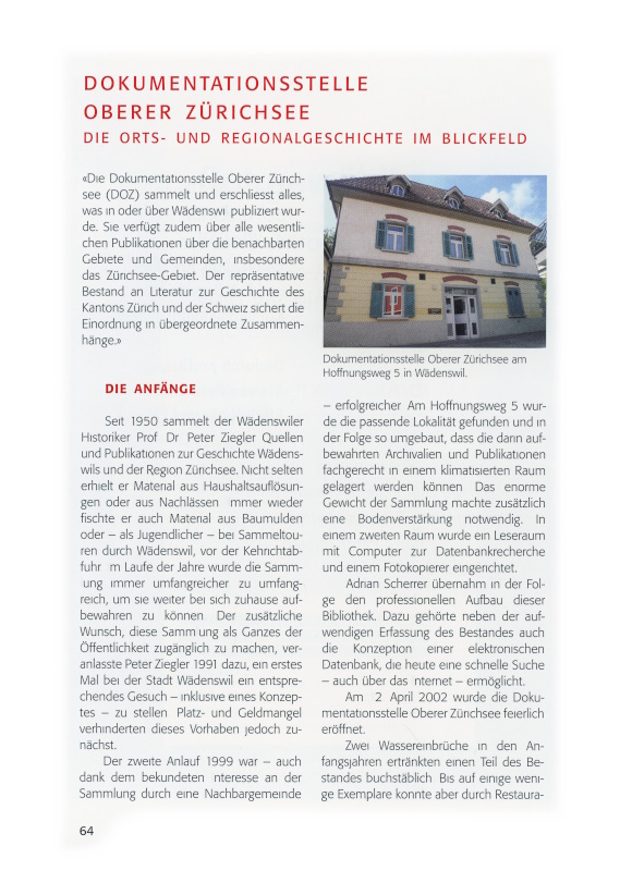 64 Dokumentationsstelle Oberer Zürichsee am Hoffnungsweg 5 in Wädenswil.
