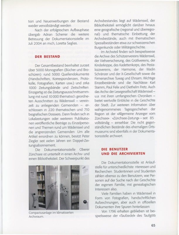 Nach der erfolgreichen Aufbauphase übergab Adrian Scherrer die weitere Betreuung der Dokumentationsstelle im Juli 2004 an mich, Loretta Seglias.