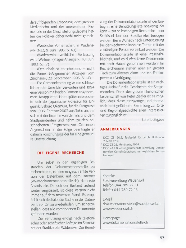 «Wädenswils weibliche Verfassung wirft Wellen» (Tages-Anzeiger, 10. Juni 1993, S. 17)