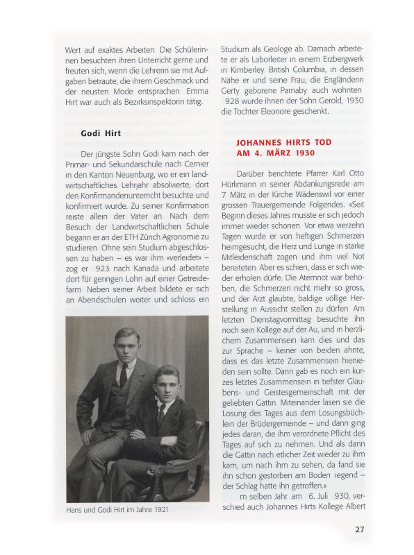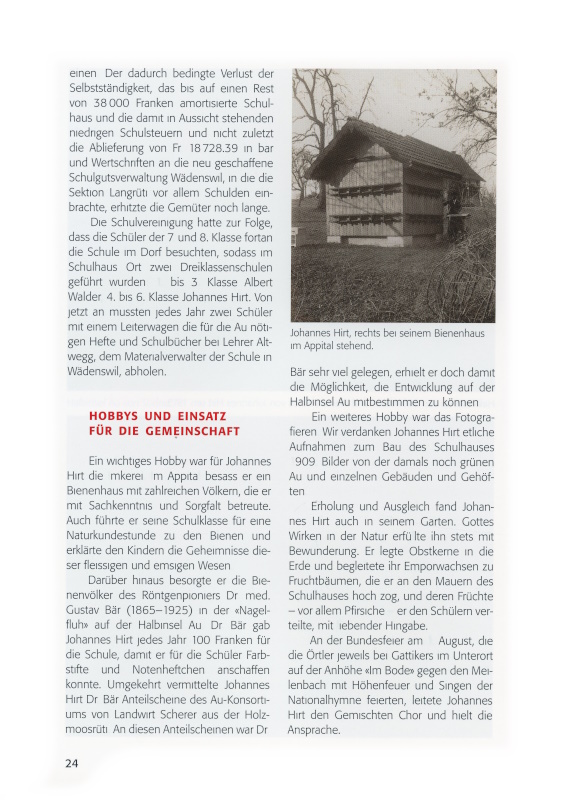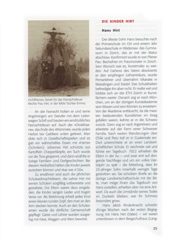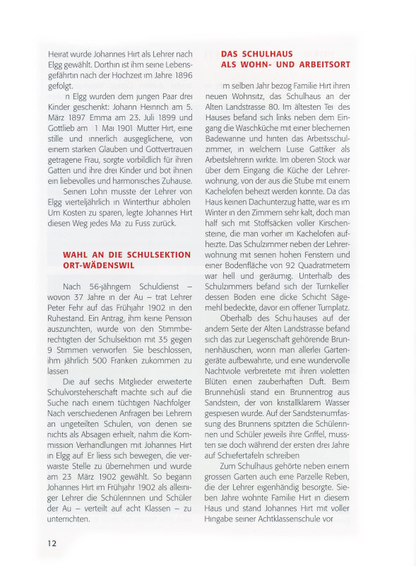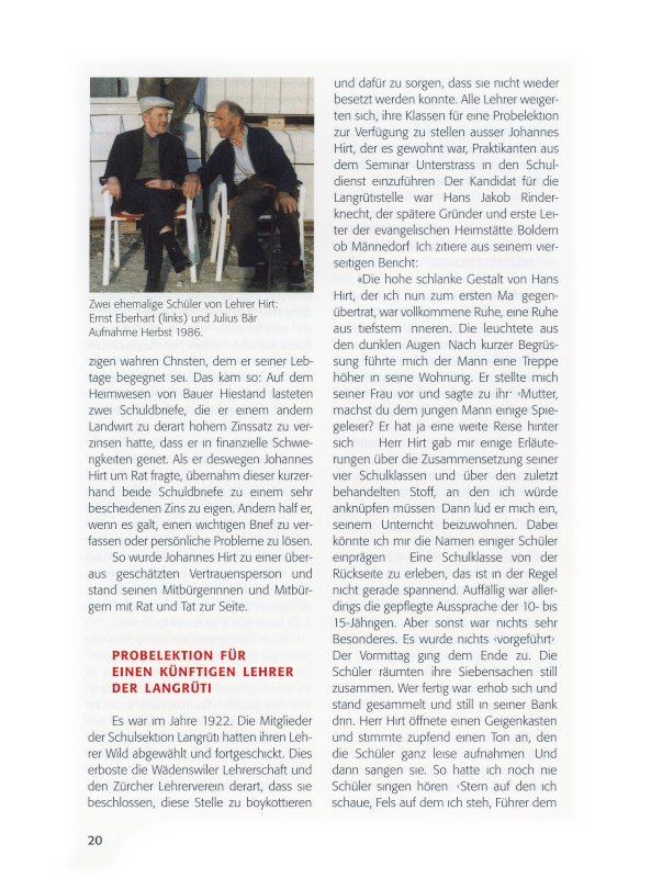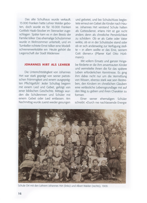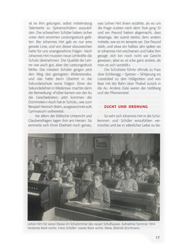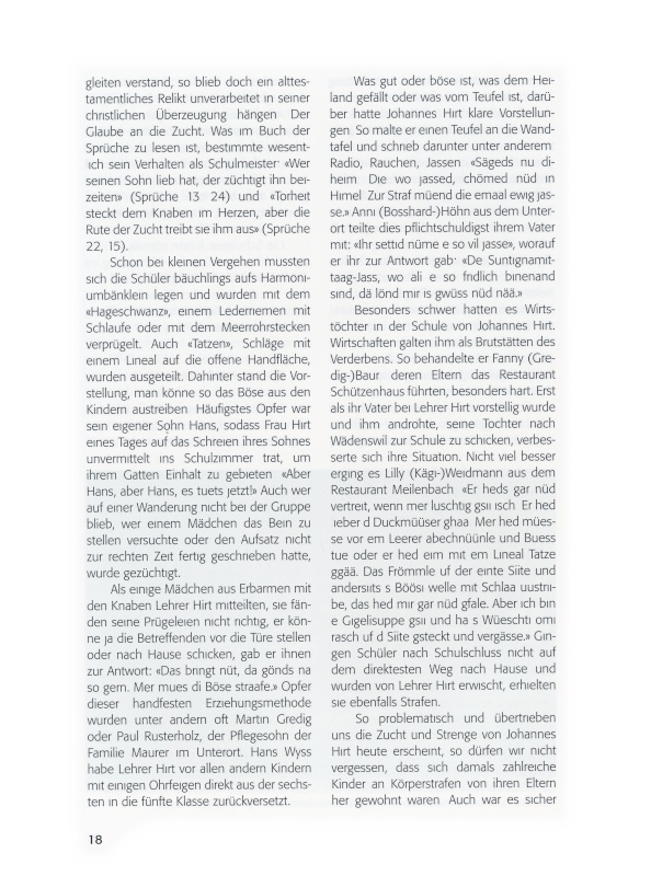 Als einige Mädchen aus Erbarmen mit den Knaben Lehrer Hirt mitteilten, sie fänden seine Prügeleien nicht richtig, er könne ja die Betreffenden vor die Türe stellen oder nach Hause schicken, gab er ihnen zur Antwort: «Das bringt nüt, da gönds na so gern. Mer mues di Böse straafe.» Opfer dieser handfesten Erziehungsmethode wurden unter andern oft Martin Gredig oder Paul Rusterholz, der Pflegesohn der Familie Maurer im Unterort. Hans Wyss habe Lehrer Hirt vor allen andern Kindern mit einigen Ohrfeigen direkt aus der sechsten in die fünfte Klasse zurückversetzt.